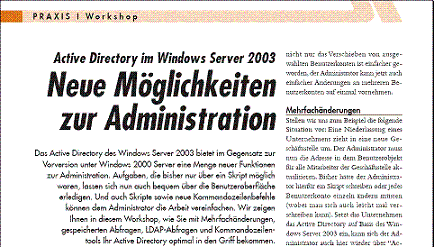 Welcome to WindowsServerFAQ.orgYou'll find here FAQs, Tipps and Tricks around Windows Server 2003. You are able to navigate to the main categories on the top. Look at the Wiki, you are able to provide your own content there. webmaster@windowsserverfaq.deNew Article: "Neue Möglichkeiten zur Administration"I describe how to ease administration in a Windows Server 2003 Active Directory using Saved Queries, Multi-Select and Multi-Edit, using the DS*-Tools or Scripting in the January-Release of the german Magazin IT-Administrator